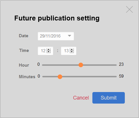 - You can now take advantage of the Date-Based Publishing feature – when editing a draft, instead of publishing the content immediately you can select the date and time at which it's automatically published. All your content scheduled to be published are accessible in a dedicated widget on the dashboard.